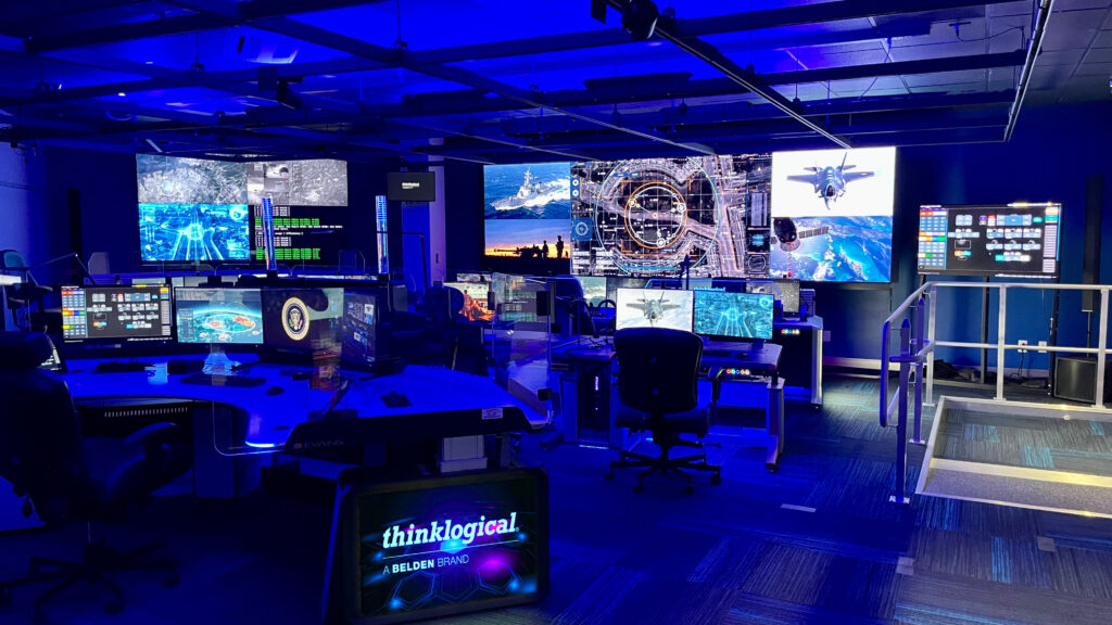 Our demonstration centers were designed to represent the latest state-of-the-art secure command and control rooms used by government, defense and intelligence organizations worldwide for complex, multiple classification command and control applications. The centers show how a Thinklogical KVM (keyboard, video and mouse) and VDS (video distribution system) solution meets the needs of these organizations by offering signal extension, switching, restricted switching, redundancy and collaboration capabilities.